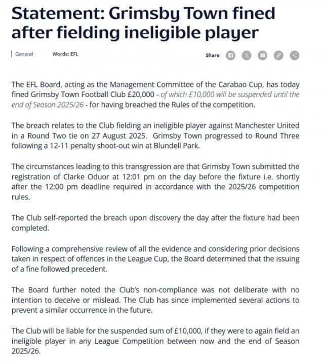 09月02日讯 EFL官方发布公告,由于格林斯比对阵曼联时使用不允洽经验的球员,对格林斯比俱乐部罚金2万英镑。格林斯比官方发布声明称,由于球队的电脑问题,球员奥多的注册肯求在截止时刻后一分钟才提交顺利,俱乐部发现违纪后主动敷陈,并领受罚金处分。联赛杯第二轮,曼联点球大战不敌英乙球队格林斯比,被淘汰出局。球员奥多在第73分钟替补出场,并在点球大战中罚丢球队第三粒点球(他是格林斯比唯独一个罚丢点球的球员)。