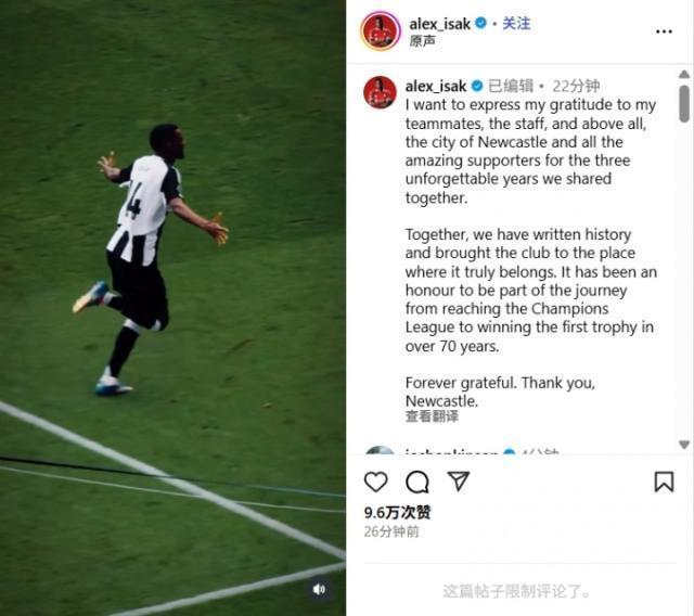 伊萨克发宣布别:耐久谢意在纽卡的三年时光,咱们全部书写了历史